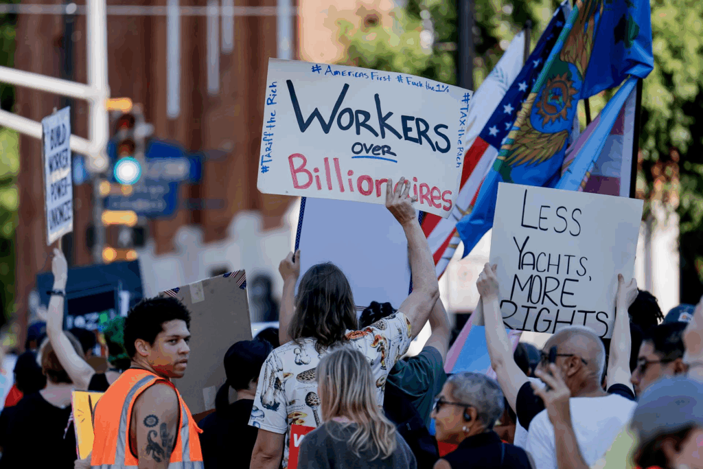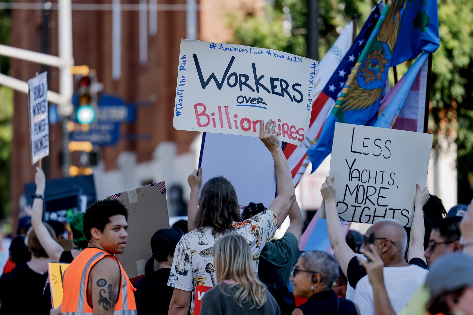 La Federación Estadounidense del Trabajo y Congreso de Organizaciones Industriales convocó más de mil protestas por todo el país, especialmente en los estados demócratas de California, Nueva York e Illinois, bajo el lema ‘Los trabajadores por encima de los multimillonarios”.